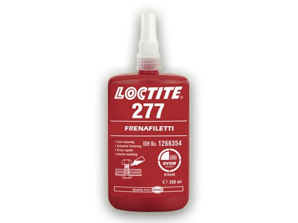 Loctite 277 ist ein hochfester Gewindesicherer, der für die dauerhafte Abdichtung und Befestigung von Gewindeverbindungen dient. Nach dem Aushärten erreicht er eine sehr gute Festigkeit und Beständigkeit. Er härtet ohne Luftzutritt zwischen zwei Metalloberflächen aus. Loctite 277 ist hauptsächlich für große Gewinde konzipiert, kann jedoch auch bei Standardgewindeverbindungen verwendet werden, wobei eine höhere Viskosität zu berücksichtigen ist. Nach dem Aushärten verhindert er das Brechen, Lösen oder vollständige Freisetzen der geklebten Teile. Daher eignet er sich beispielsweise zur Befestigung und Sicherung wirklich großer Konstruktionsschrauben und Ähnlichem. Ein weiterer Vorteil ist die relativ hohe Wärmebeständigkeit von bis zu 200 °C.
