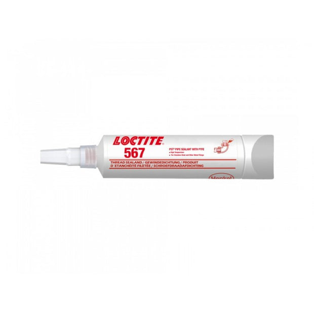 Loctite 567 ist eine spezielle hochviskose Acrylatdichtung für konische Gewinde aus Metallrohren und -fittings (z.B. aus Edelstahl, Aluminium) bis zu einer Gewindegröße von M80. Dieses Produkt ist eine glatte, graue Paste mit niedriger Festigkeit, die ohne Luftzutritt in der Fuge aushärtet, Vibrationen und Stößen standhält und ein Lösen oder Durchsickern der Verbindung verhindert.